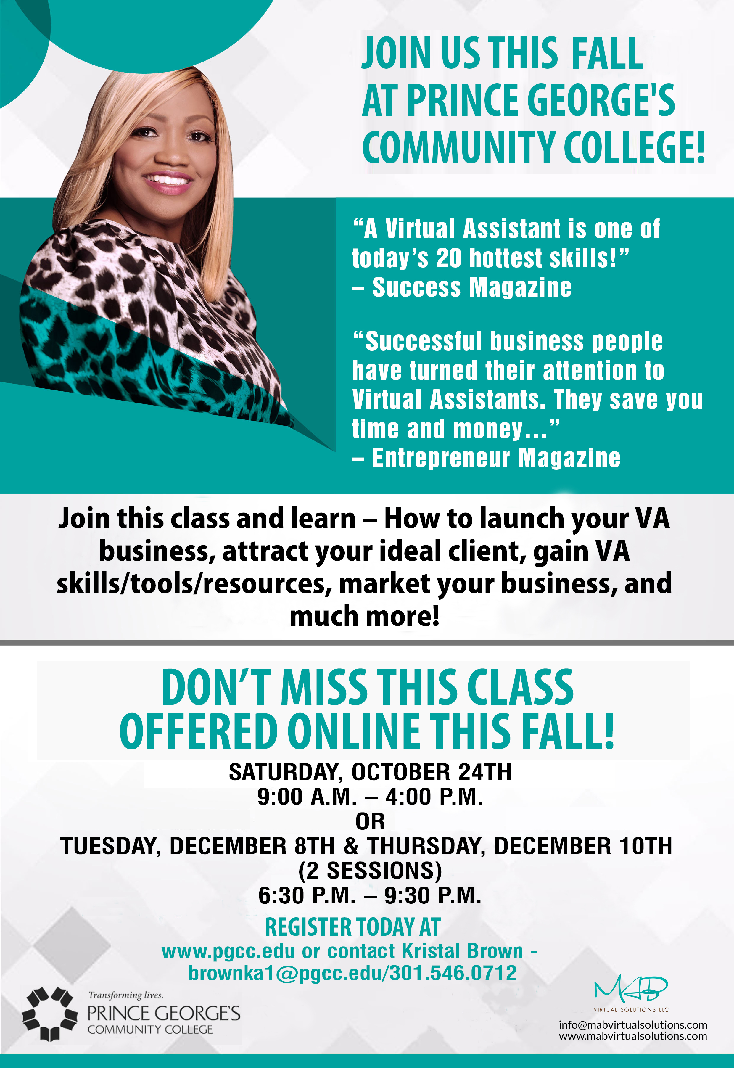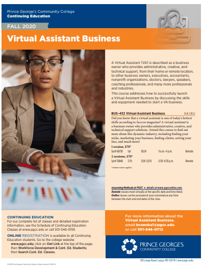 To register for this class, visit www.pgcc.edu and enroll under “Owl Link”. The course is BUS-432. For more information contact Kristal Brown at brownka1@pgcc.edu or call on 301.546.0712.