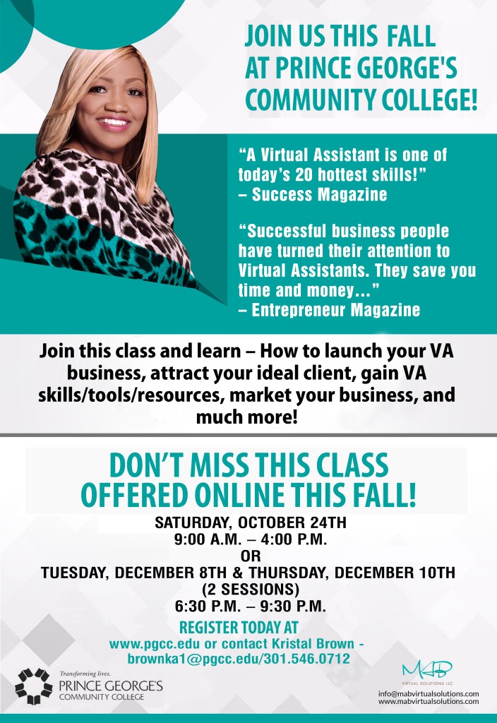 I would like to personally invite you to the “Virtual Assistant Business” class offered online Tuesday, December 8th and Thursday, December 10th from 6:30 p.m. – 9:30 p.m. This is a two-part class. What will I learn by taking this class? I’m glad you asked this question too! This class is designed to help you successfully launch your Virtual Assistant business, discussing the skills and equipment needed, attracting your ideal client, marketing your business and much more.